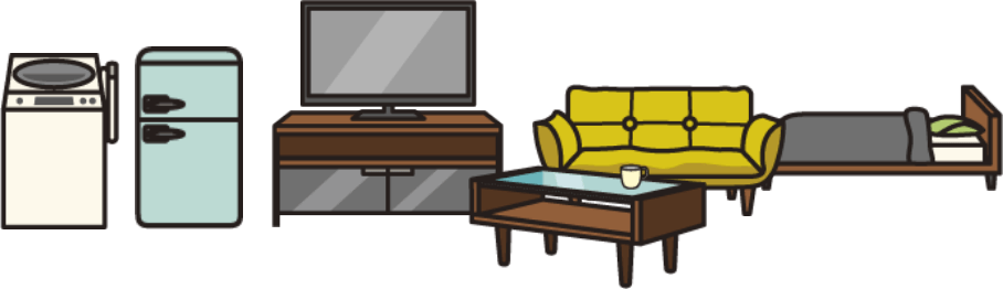 洗濯機、冷蔵庫(2ドア)、テレビ、テレビ台、ソファー、テーブル、ベッド